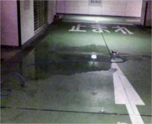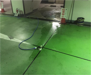 11.B1F 14駐車スペース前車路の伸縮目地からの漏水の疑いあり・補修方法(①伸縮目地に注入孔を開け②低粘土のコニシエポキシボンド206を注入します③注入孔はシーリング材で補修