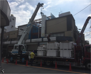 69.コンクリート工事・屋上防水保護コンクリート、ミキサー車・ポンプ車配置状況